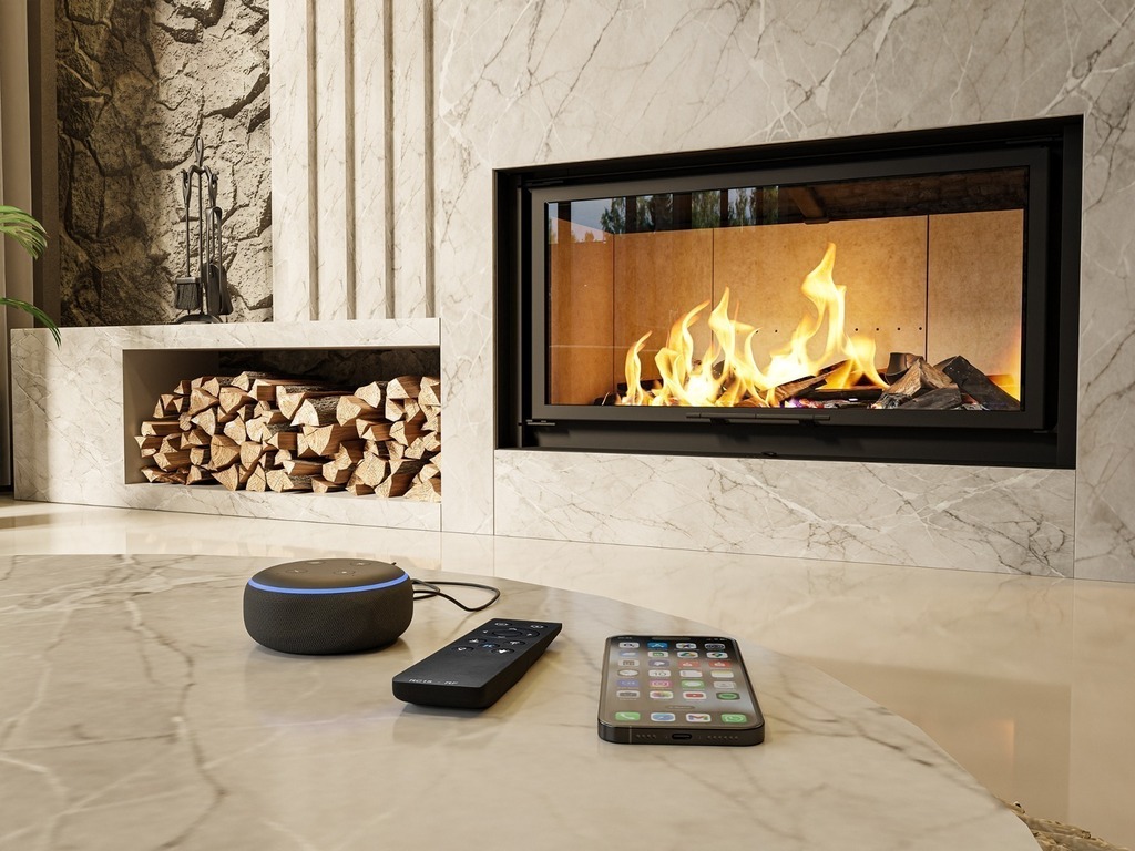 Versão Automatizada: Controle total na palma da sua mão! Abra a porta da lareira por meio de comandos de voz via Alexa, controle remoto ou aplicativo para smartphone. Uma solução prática, segura e moderna para quem valoriza inovação e conforto.